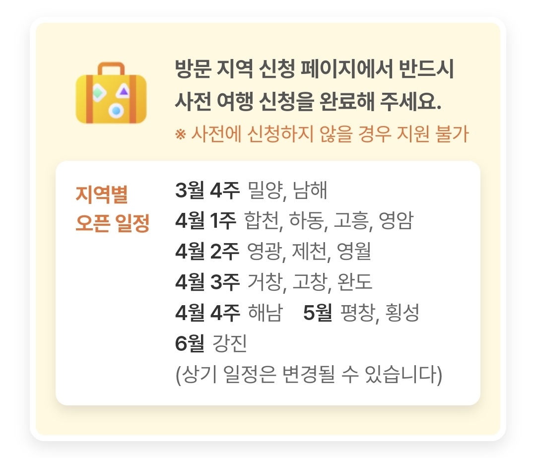 1. 신청방법 : 4-8월 지자체 홈페이지에 접수하기. ---> 신청기간 내 여행경비 지출 ---> 여행경비 50% 지역페이로 환급