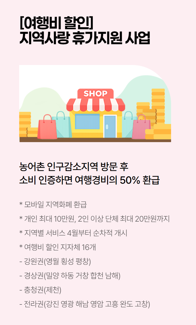 인구소멸도시 16곳을 방문하기 전 한국관광공사 홈페이지에서 미리 신청하고, 지역방문 후 인증 하시면 여행 금액의 50%를 그 지역의 지역화폐로 돌려줍니다.